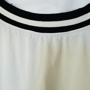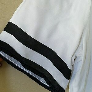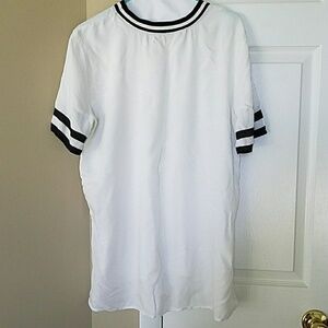 Short sleeve top, long, shorter in front. White with black stripes on sleeves. Medium from Hollister. 100% viscose.