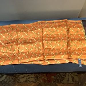 Long rectangular Echo scarf in orange silk with yellow chain motif and brown bordered ends.