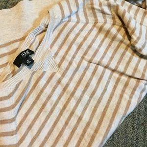 This sweater has a cashmere feel-- I bought it just because of how soft it was! Unfortunately it is too big for me. Beige/cream color with tan stripes. Very cute, very soft. :)