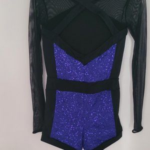 Attached shorts are sequin spandex with shiny spandex insets at the sides