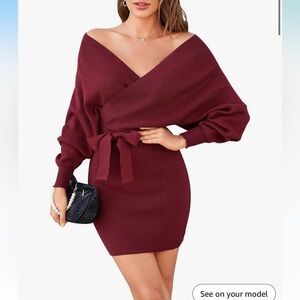 Chic burgundy wrap dress with a stylish bow tie. Perfect for any occasion.