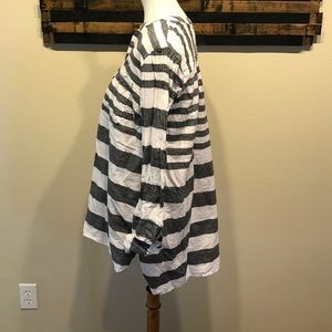 Gray and white, long sleeve, half button blouse. Fits like a large even though it's a 2x. Long in the back, shorter in the front. Good with leggings.