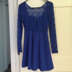 Blue dress with lace pattern on top and fitting waist, back scoops down with a bow. Worn once