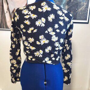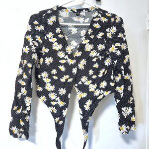 Black long sleeve crop top with daisies and polka dots. Buttons up at the front and also ties at the waist. Brand is Divided by H&M, size US 2. Gently used