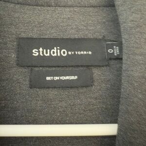 Torrid Studio blazer, lined, hook and eye closure. Cute peplum back. Has slight stretch to it throughout for comfort. Thick material, drapes beautifully. Easy care.