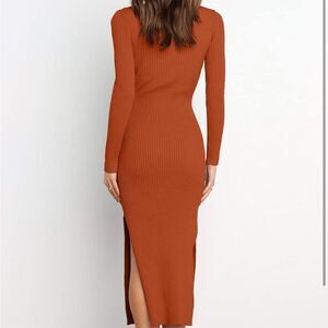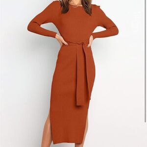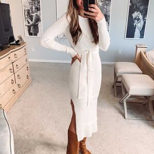 Cute sweater dress with round neck, long sleeve, slit sides, tie waist, midi length. Materials: 50% Viscose, 30% Nylon, 20% Polyester