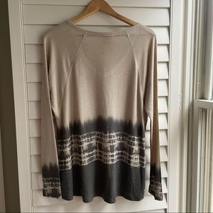 The shirt is in good used condition with no stains and has light signs of wear. Soft beige color with grey tie dye design.
