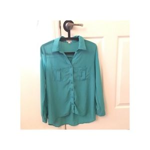 This turquoise button down is lightweight, airy, and versatile. It has pockets on both sides and is comfy. Can be worn in the fall as a shirt or during spring and summer over tank tops when there's a breeze.