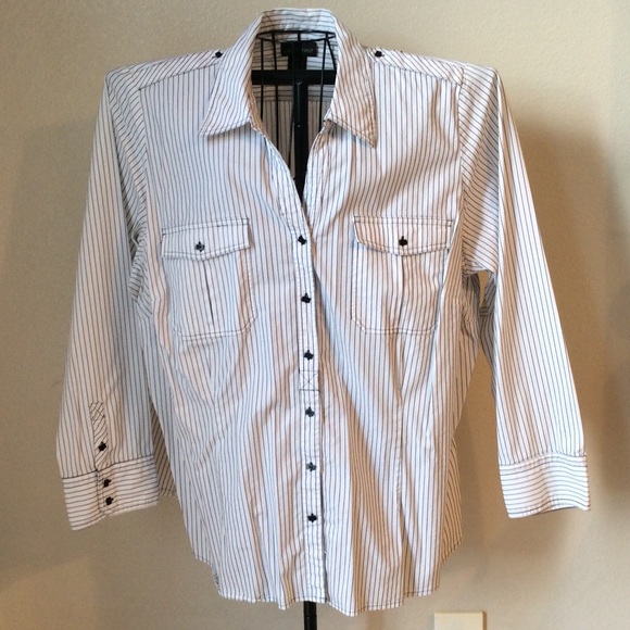Size 26-28 Long sleeved cuffed, low cut neck line, black & white pinned striped shirt. Made of 60% cotton, 24% nylon, 13% rayon & 3% spandex. Washable. Excellent condition.