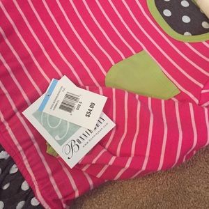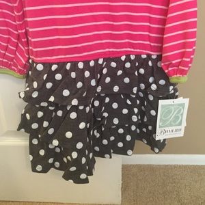 Pink pinstriped long sleeve top with attached ruffle bottle grey and white polka dot skirt. NWT