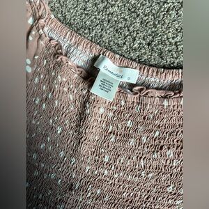 This is a long sleeved pink top with white polka dots in size small from brand Urban Romantics. Wrinkly from being packed. In good condition.