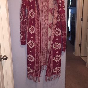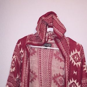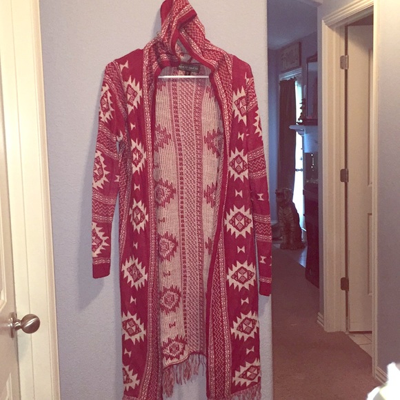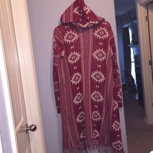 Light and long sweater with hood Color is red with a creamy white Aztec design non-smoke free home great condition wore it once it can be dressed up or dressed down no holes or tears with long sleeves any other questions feel free to send me a message and please share thank youπππΌππΌππΌπ€©π€©π€©!!!!!!