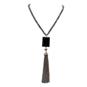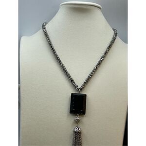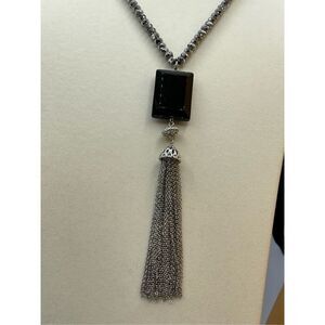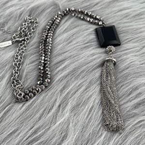 The Limited 20” long boho tassel necklace. The decor is 5” long ! Lobster claw clasp. Black glass, silver colored metal and gun metal grey faceted beads.
