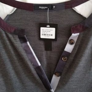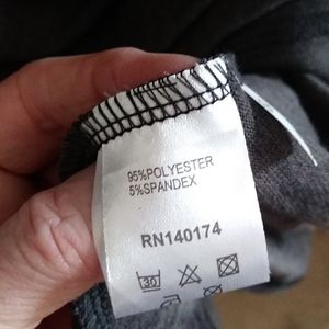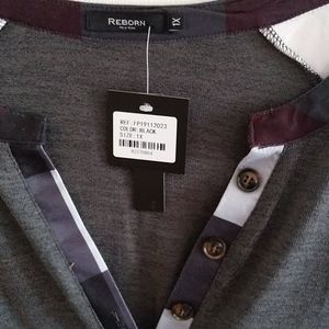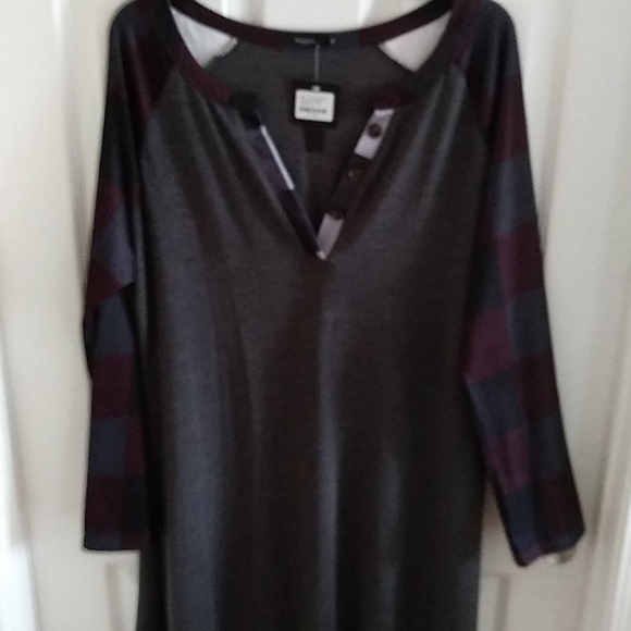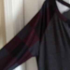 Dark grey with purple and black plaid sleeves. Long enough for a dress too