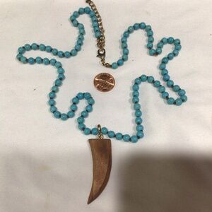 Long turquoise glass bead necklace with wooden tooth. I was told when I was when purchased that these were real turquoise, and that you can see the veins running through them, but I am not 100% sure. I have put a penny in the photos so you can see approximate size of the beads. The necklace is quite long. It measures approximately 28 inches with a 3 inch extender chain. The wooden tooth is approximately 2 inches. The stones are cold to the touch. if you have any questions or need more photos, please let me know. I’m still running the special if you purchase 10 listings of Jewelry under the price of $20 you get 50% off the entire purchase also I’m always open to any reasonable offers. Thank you and have a great day.