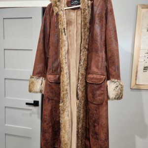 Long faux fur coat with waist belt. Faux fur down the front and around hood. Used in excellent condition. No stains or tears.