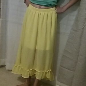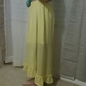 Long yellow dress. Has two small side slits. Small ruffle at the bottom