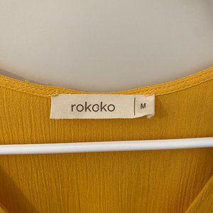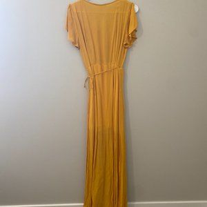 Long yellow flutter sleeve dress. V-neck with snap and waist tie