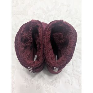 Step into cozy comfort with these pre-owned LongBay Women's Bootie Slippers, used only once and in excellent pre-loved condition. These stylish and snug slippers feature a classic micro-suede and soft chenille knit upper in a rich wine red color, offering a luxurious touch. Designed for ultimate warmth, they boast a toasty and cushy lining of skin-friendly fuzzy faux fur that extends past the ankles.