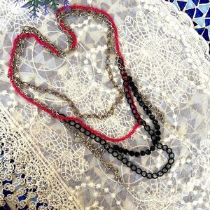 Fun costume piece. A multitude of graduated chains fall freely. Silver tone, distressed silver tone, black, & bright pink combine with black and clear faceted acrylic beads. The shortest strand is 24” and they drop down from there. Lobster clasp. Likely 90’s/00’s but with a bit of an 80’s vibe. Excellent vintage condition with no flaws - please see included pics as they are part of the description. So fun with its bright pop of pink! Flexible styling options.