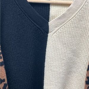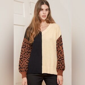 Nothing spells unique style like this glamorous colorblocked sweater with panels of animal print. An oversized fit, long dolman sleeves and a flattering V-neckline.