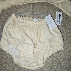 Two-piece set includes long-sleeve top and matching bubble short bottoms.