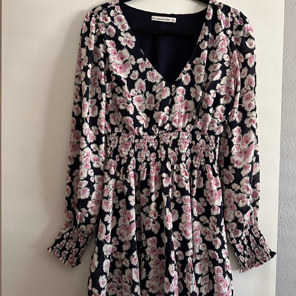 Flattering long-sleeve mini dress in a floaty chiffon fabric and babydoll silhouette, featuring dropped waist detail, corset-style seaming details, ruffled underbust detail, flowy skirt and v-neckline.