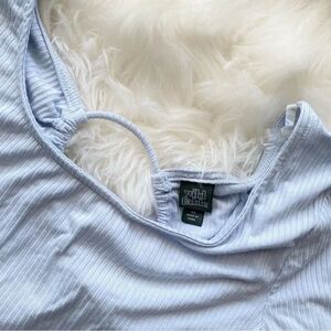 Light baby blue bodysuit with lace up open back and snap closure. Thong style back.