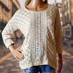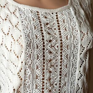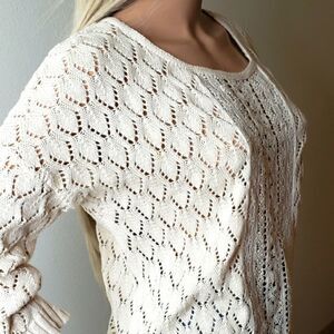 This is a beautiful light knit sweater with a scoop neck. It is see through with the lacey knit patterning so you would have to wear something underneath :) Any questions please ask:)