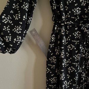 Flowy and comfortable, mid-calf length long-sleeved button-up V-neck dress from Uniqlo - worn only once, perfect condition. Buttons all the way up the front, so can be worn as a robe or duster as well as a dress. Deep side pockets, one per side. Tie at waist is completely removable. Slightly belled sleeves have elastic at the ends, so you can push them up to anywhere and they'll stay put and look cute! Stretchy jersey fabric is warm but breathable, great all-season dress.