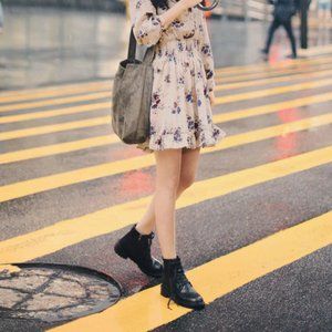 Short chiffon dress comes with a dainty floral print in a muted palette. Ruffled split neckline gives way to a stretchy smocked waistline and slightly ruffled hem. Unlined. Base layer recommended.