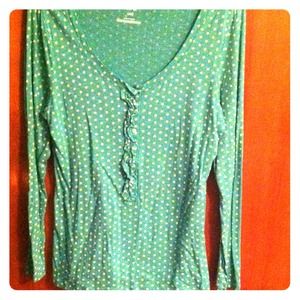 Turquoise, long-sleeved shirt with off-white polka dots. The front has six buttons that can be undone with ruffles around them.