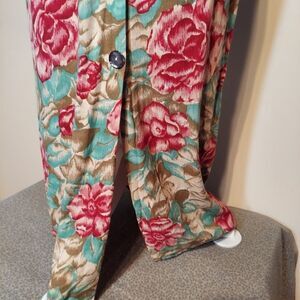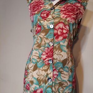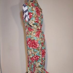 Mint condition vintage floral dress. Fold down collar & 8 beautiful buttons. Floral ties in back or front. Sz small. approx measurements laying flat: 47"L from shoulder x 18"w. Slit from last button to hem is 15 inches. 100% rayon.