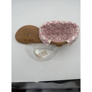 This Longaberger basket set in warm brown is a beautiful addition to any collection. Woven with care, this oval-shaped basket is perfect for all occasions and features a plastic liner, cloth liner, wall hook and lid. The basket is small in size, measuring 6 inches in length, 4 inches in width, and 4 inches in height, and weighs only 9 ounces.
