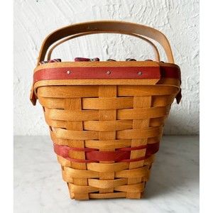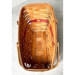 Longaberger Christmas Collection 1991 Edition Yuletide Traditions Basket. Sleigh basket with double handles and red and green plaid fabric liner. Front to back 13-1/4" x 87-1/4" wide. Front is 3-1/8" high and back is 7-3/4" high.