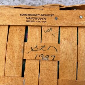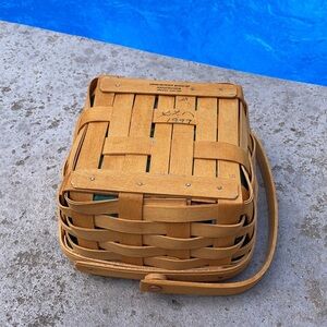 This is a great catch all basket for the Longaberger lover! It has a rotatable handle and comes with fabric liner (no plastic liner) and a garter you can change out for different occasions. Liner fabric is hunter green with yellow flowers and pink/purple berries.