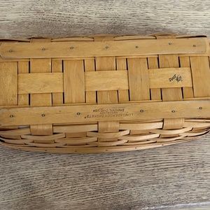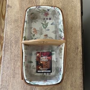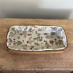 2002 Longaberger Bread Basket with Botanical Fields fabric liner, two plastic protectors and wood divider & card. Basket is in overall good condition with slight scuffing on the bottom. No splits or cracks. Comes from a smoke free home. 7.5" x 14.5" x 3.5"
