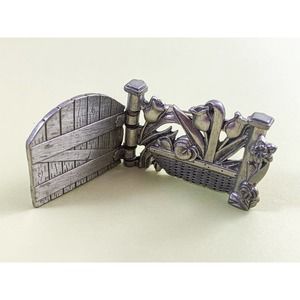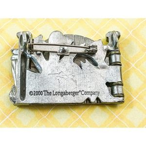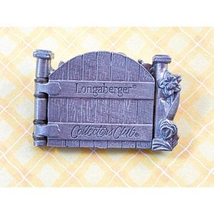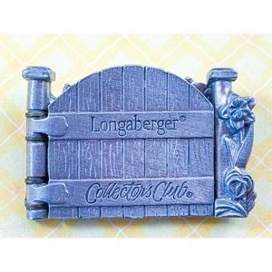This unique hinged brooch will help you share your love of gardens. A beautifully detailed pewter garden gate opens to show a basketful of tulips. Engraved with Longaberger® Collectors Club on the front. The back is signed ©Longaberger® Company.