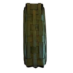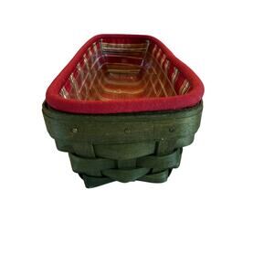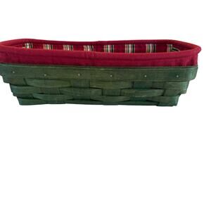 The basket is green. The deep red, green and white striped liner is the "Holiday Stripe" fabric. The protector is the hard plastic version. The basket measures approximately 11 1/2" x 4 7/8" x 2.75".