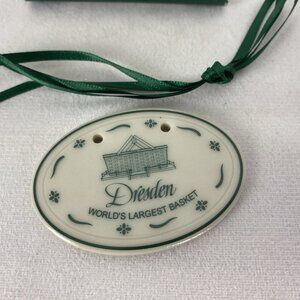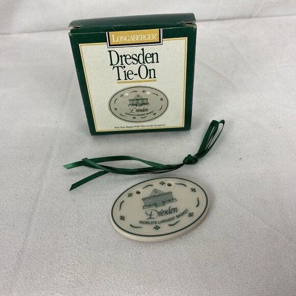 Add a touch of tradition to your decor with this beautiful Longaberger Dresden Tie-On. Made in the USA, this small oval-shaped pottery tag features a green print and a beige color with a ribbon closure. The tag is perfect for all occasions and comes boxed with a single pack.