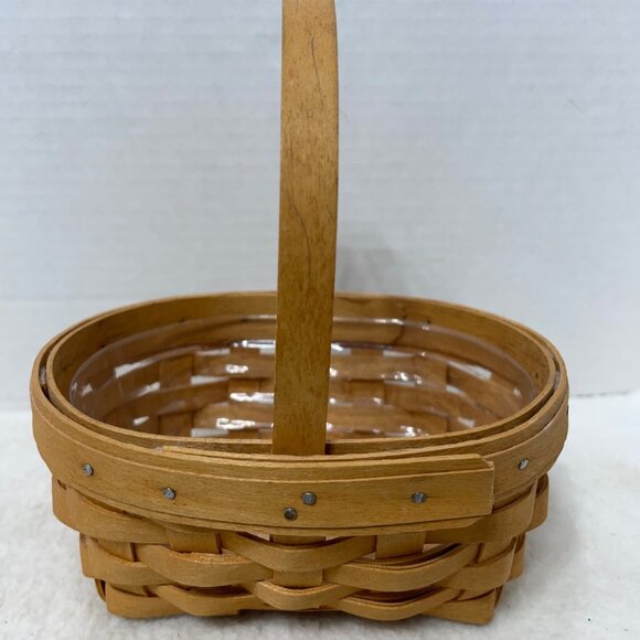 This Longaberger basket is handwoven with precision in the USA, featuring a sturdy handle and a removable plastic liner for versatile use.