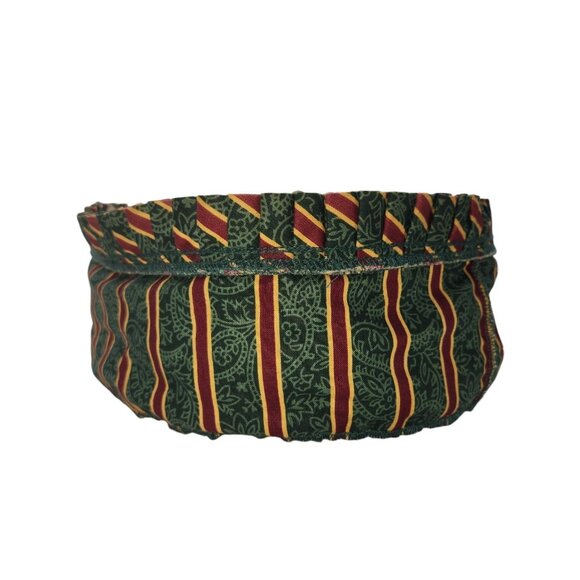 Longaberger Holiday Cheer basket liner. Imperial Stripe pattern. Cotton with burgundy red, dark green and gold print. Measures approximately 8-1/2" diameter, 4-1/4" high. Pre-owned in excellent condition. No stains, fading or damage.