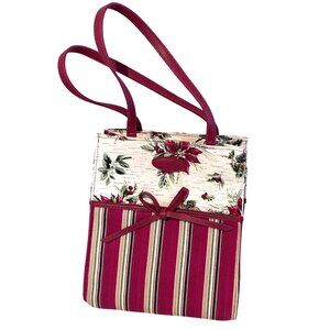 This Longaberger tote bag combines festive holiday florals with elegant red and green stripes. It's an ideal accessory for seasonal events, offering both style and function. The magnetic snap closure ensures secure storage, while the bow accent adds a touch of charm.