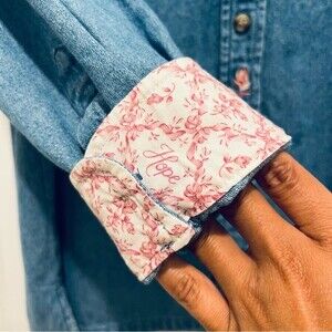 Longaberger Homestead Denim Button Up Shirt with pink Floral Embroidery and Contrast Cuffs in Women's Size Medium