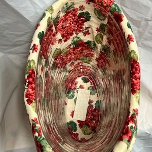 Used condition! 2002 May Geranium Longaberger Basket with protector and ceramics tie on. Does have a couple small rub marks on back, May possibly come off. Smoke free home!