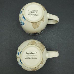 Longaberger Pottery "Botanical Fields" Coffee Mugs - Set of 2. Discontinued pattern featuring flowers on one side and a butterfly on the other. Substantial mugs measuring approx. 3.5" across and 4" tall. Excellent pre-owned condition.