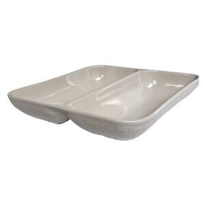 • This Longaberger ivory ceramic divided dish offers both beauty and functionality, ideal for entertaining or everyday meals. Crafted with clean lines and a classic glazed finish, the dish features two equal compartments—perfect for serving dips, sauces, snacks, sides, or condiments.