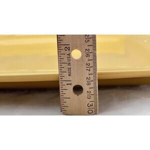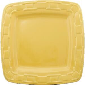 This is a Longaberger Pottery Soft Square Dinner Plate in Butternut yellow. Measuring approximately 11" square, it is made of vitrified pottery, which is freezer, microwave, dishwasher and oven safe.