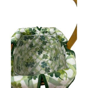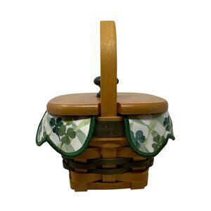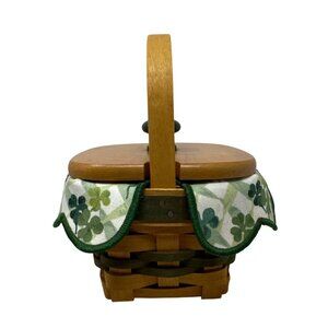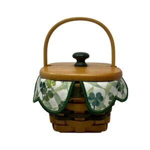 This handwoven Longaberger basket features a 1999 design with a charming shamrock-patterned fabric liner. The wood lid adds functionality while maintaining its aesthetic appeal. Ideal for decorative storage or festive use.