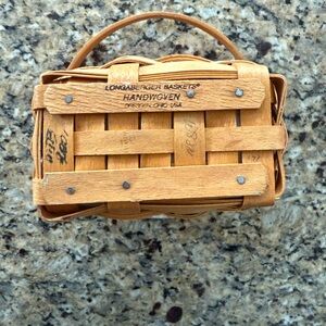 This Longaberger basket showcases a delightful tan and red color palette, enhanced by a charming floral liner. The basket's design adds a touch of elegance and functionality to any space, making it a perfect accent piece for your home.